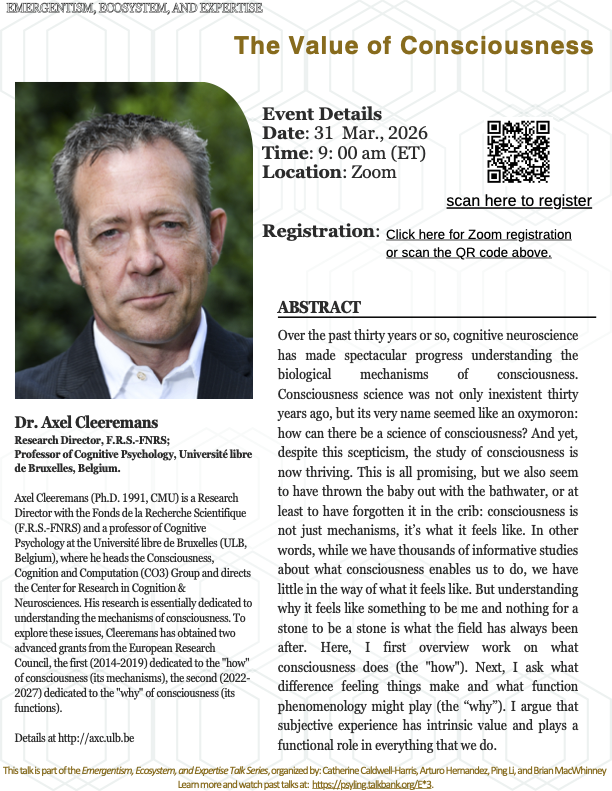The E*3 presentation series is dedicated to exploring the emergence of structure and process in language and cognition. Emergentism, broadly defined, examines the role of the physical, neural, and social environment in providing mechanistic constraints that shape both temporary and semi-permanent structures on various structural levels, eventually leading to linguistic and cognitive expertise. E*3 also emphasizes the role of ecology, the environment at various levels (current, over time, or at the time of learning), as a factor in this process. We also invite presentations that challenge specific emergentist proposals, as well as presentations that formulate constraints through alternative and complementary formal models.