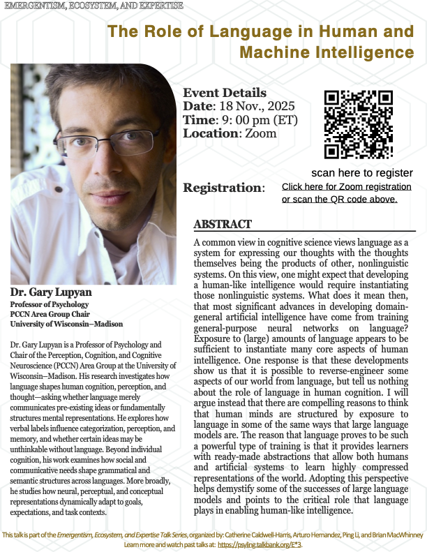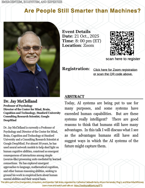 The series is co-organized by Catherine Caldwell-Harris, Arturo Hernandez, Ping Li, and Brian MacWhinney. To receive notifications for registering for upcoming talks, you can send a subscription request to emergentism+subscribe@googlegroups.com or an email to macw@cmu.edu. Talks are typically scheduled for the third Tuesday of each month at either 9:00 AM EST or 8:00 PM EST.