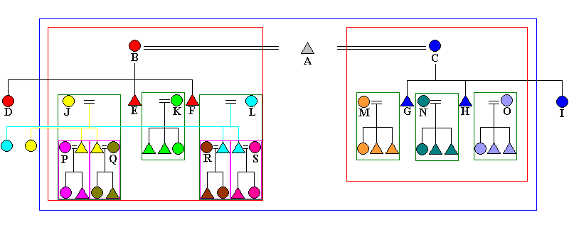 In this scenario, the new domestic unit begins from a different base than the one first introduced. A group of brothers (only 2 in the diagram) and their wives, rather than a single person, now form the elder generation. The first-born brother assumes the title of ezi and the corresponding ritual, political, and economic rights and responsibilities. He holds authority over his junior brothers and their children as well. Subsequent generations develop by accretions through marriage and patrilocal residence, as the same way as a household started by a single individual.