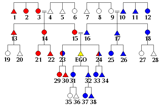 Note that siblings are both agnatic and uterine relatives. Non unilineal kin are termed cross relatives because, at some point in the sequence of linking relatives, a gender change occurs. Individuals 19, 20, 27, and 28 are Ego's cross cousins because the parents involved are opposite sexed siblings, a brother and sister in each case. One set of Ego's grandchildren, 35 and 36, are also his cross relatives because of a male-female sequence from ego to his daughter.