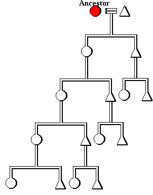 descent exclusively through females from a founding female ancestor. The individuals indicated in red constitute the matrilineal descendants of a common ancestress. Both men and women are included in the patrilineage formed but only female links are utilized to include successive generations. (Use your browser's STOP option to freeze the animation. RELOAD to resume.) |