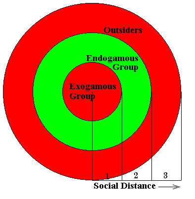 According to considerations of exogamy and endogamy, we can represent marriage patterns as determined by a society's concept of social distance as indicated in the following diagram: