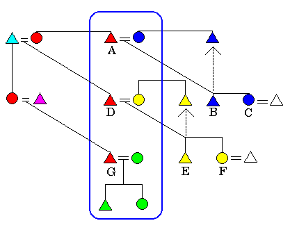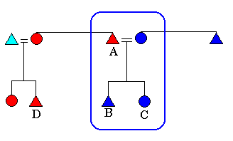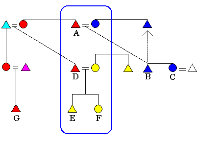 In the next generation, the children of the family, B and C, leave their natal household. The son (B) join's his mother's brother, and the daughter (C) joins her husband. In the same vein, A's adult sister's son (D) moves in with him and eventually marries and brings in his wife. D's young children reside with their mother and father until adulthood. (Note that matrilineally related kin are shaded in the same coulour.