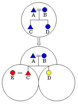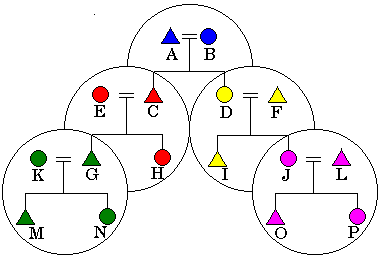 In the next generation, C has had children, and D has married and had children. One child of each couple has established his/her own nuclear family. There are now four new households in addition to the original unit.